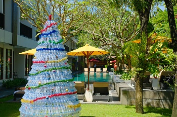 It took the Housekeeping team more than two weeks to collect discarded plastic bottles that had been thrown away as part of the daily rubbish generated by the hotel. Each bottle was carefully washed and dried in preparation for the final assembly process. The Engineering team worked for several hours every day to construct the tree with the help of some very eager in-house guests. The end result is a stunning piece of craftsmanship that pays tribute to local Balinese creativity.